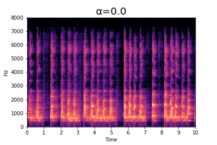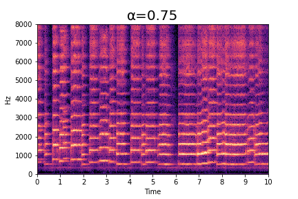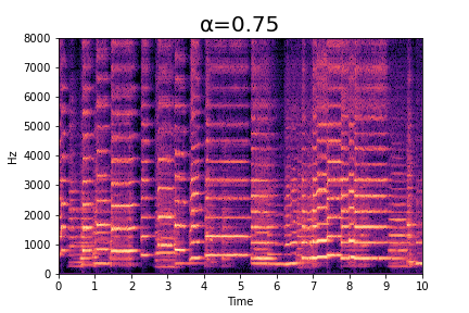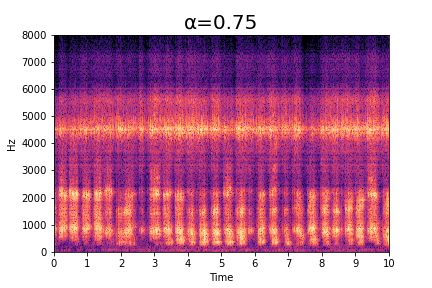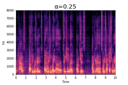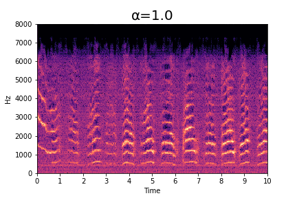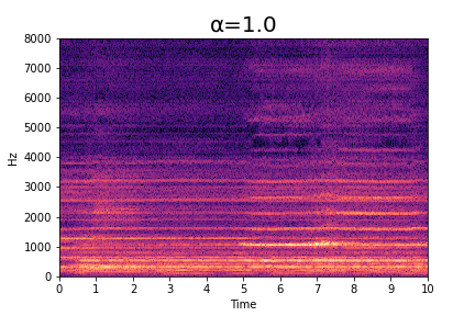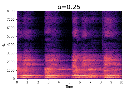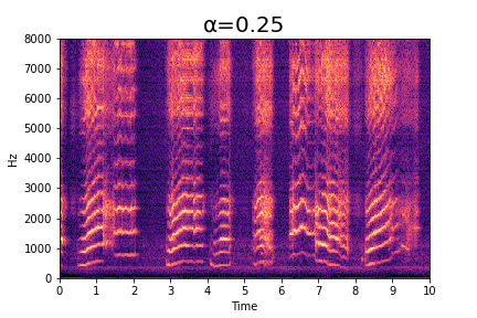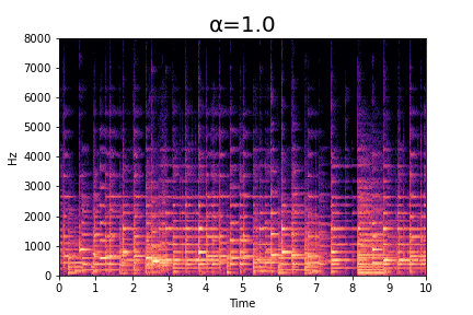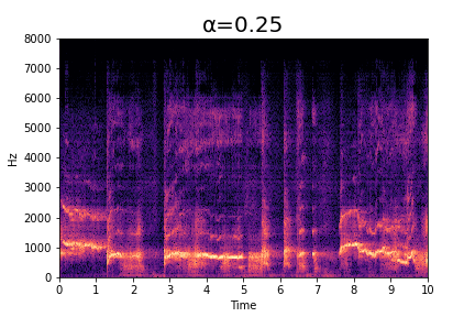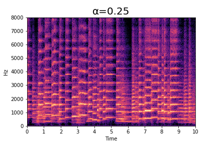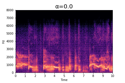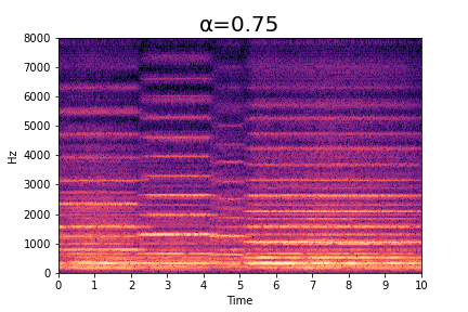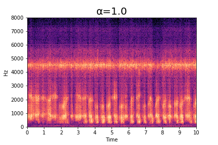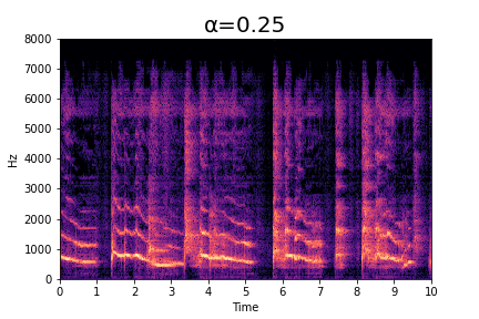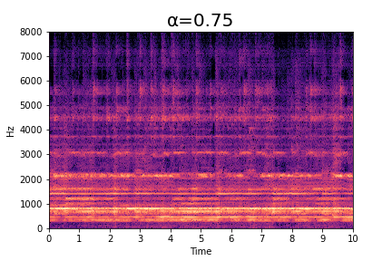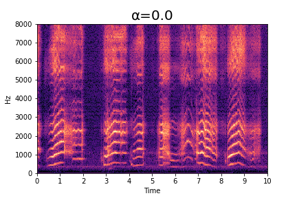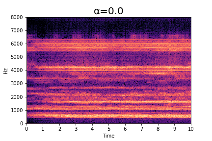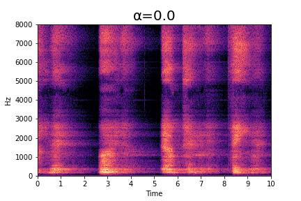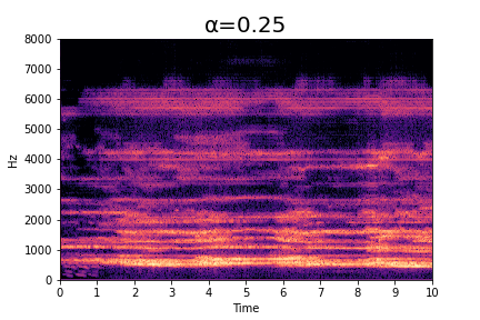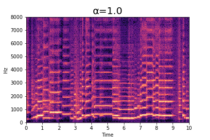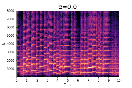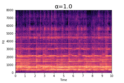 At α=0, the audio sounds like the background music of a horror movie. And at α=1.0, the audio is that of a fast tempo piano playing. Observe how at α=0.25, the audio sounds less ghostly and at α=0.5 you can start hearing the piano, but recreating the ghostly sound. At α=0.75, the audio is mostly piano music.
