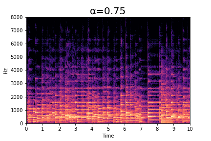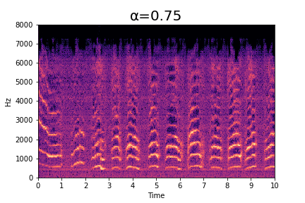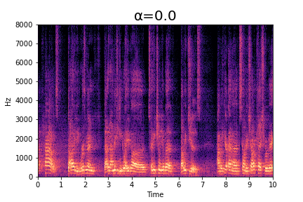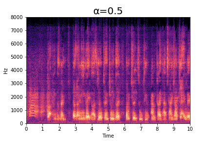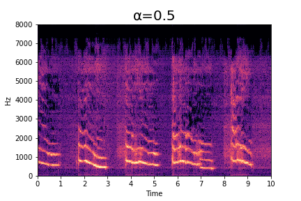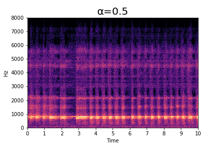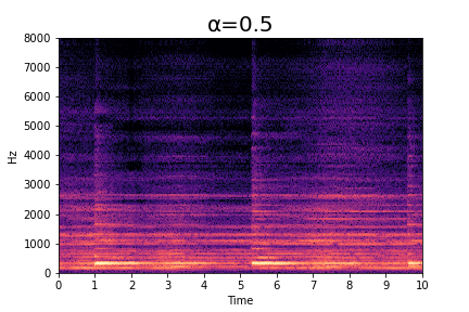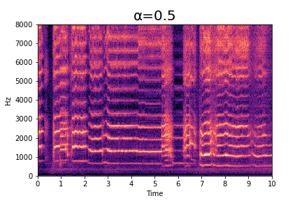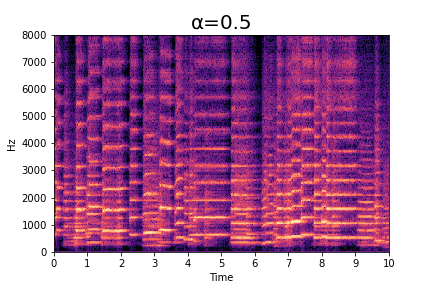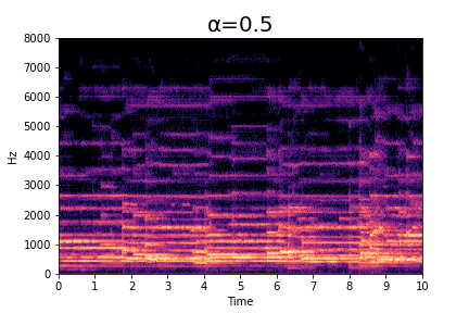 At α=0, you can clearly hear the sharp attack of the brass instrument. At α=0.5, you can hear the timbre of the clarinet along with the sharp attack of the trumpet.